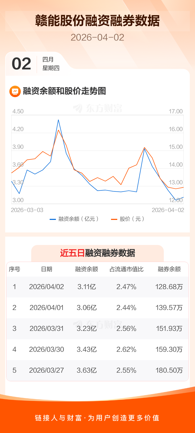 交易所最新数据显示,赣能股份于2026年4月2日获融资买入3350.13万元,融资偿还2824.86万元,当日融资净买入525.27万元。目前,该股融资余额3.11亿,占流通市值比例为2.47%。