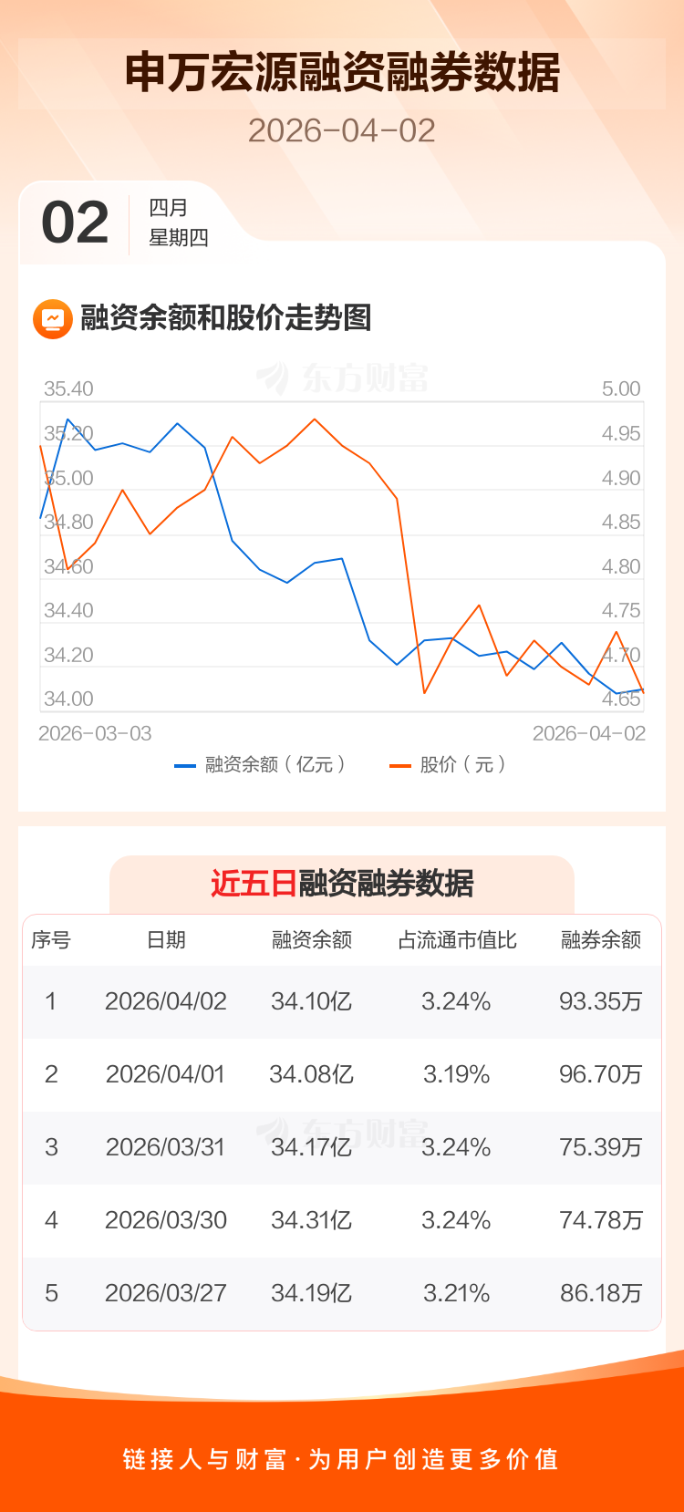 交易所最新数据显示,申万宏源于2026年4月2日获融资买入4606.13万元,融资偿还4421.88万元,当日融资净买入184.25万元。目前,该股融资余额34.10亿,占流通市值比例为3.24%。