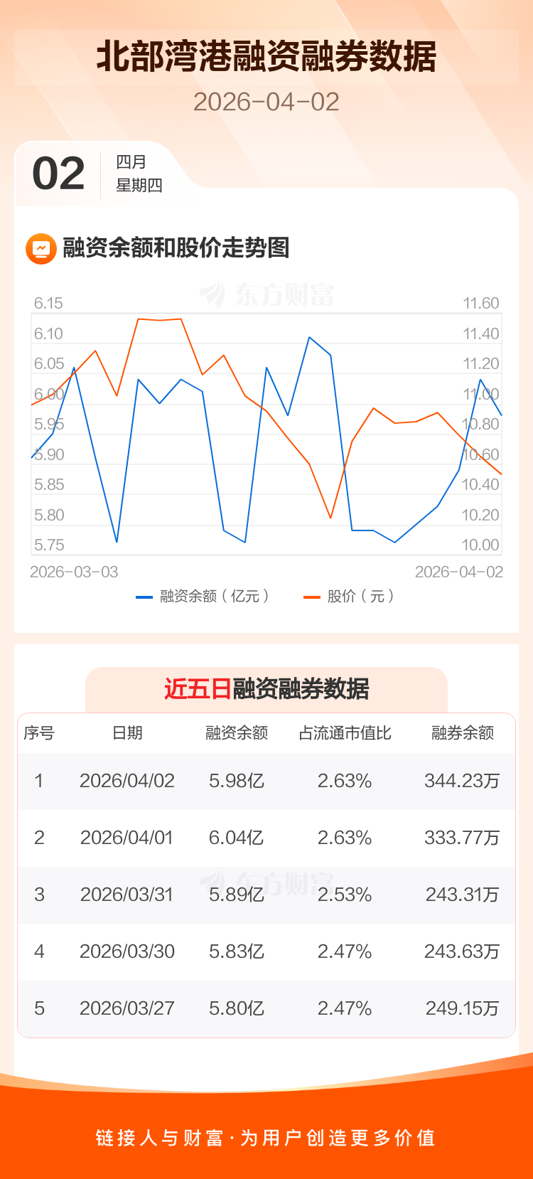 交易所最新数据显示,北部湾港于2026年4月2日获融资买入2534.84万元,融资偿还3077.83万元,当日融资净偿还542.99万元。目前,该股融资余额5.98亿,占流通市值比例为2.63%。