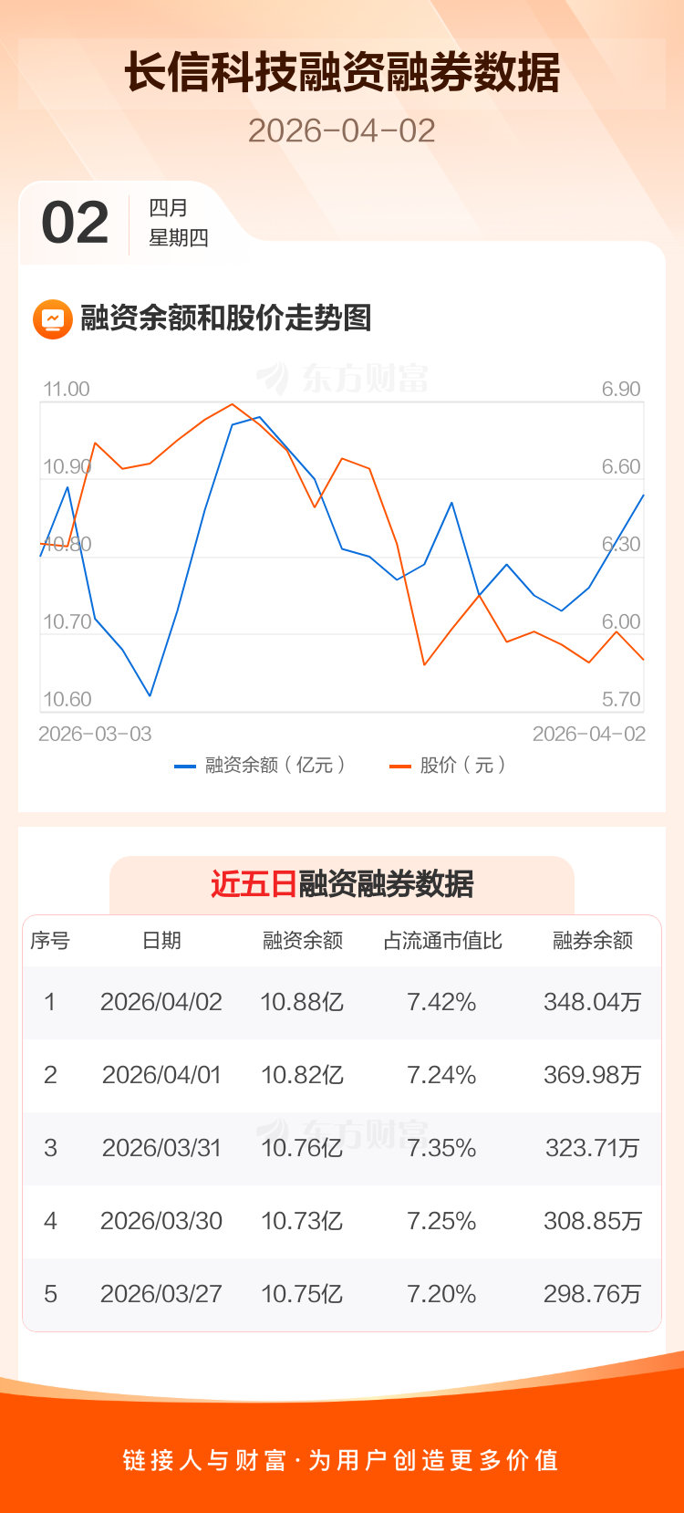 交易所最新数据显示,长信科技于2026年4月2日获融资买入2898.04万元,融资偿还2278.85万元,当日融资净买入619.18万元。目前,该股融资余额10.88亿,占流通市值比例为7.42%。