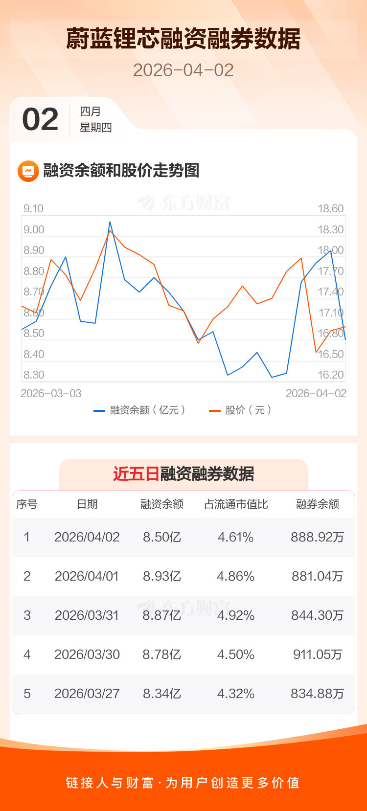 交易所最新数据显示,蔚蓝锂芯于2026年4月2日获融资买入5421.99万元,融资偿还9764.48万元,当日融资净偿还4342.49万元。目前,该股融资余额8.50亿,占流通市值比例为4.61%。