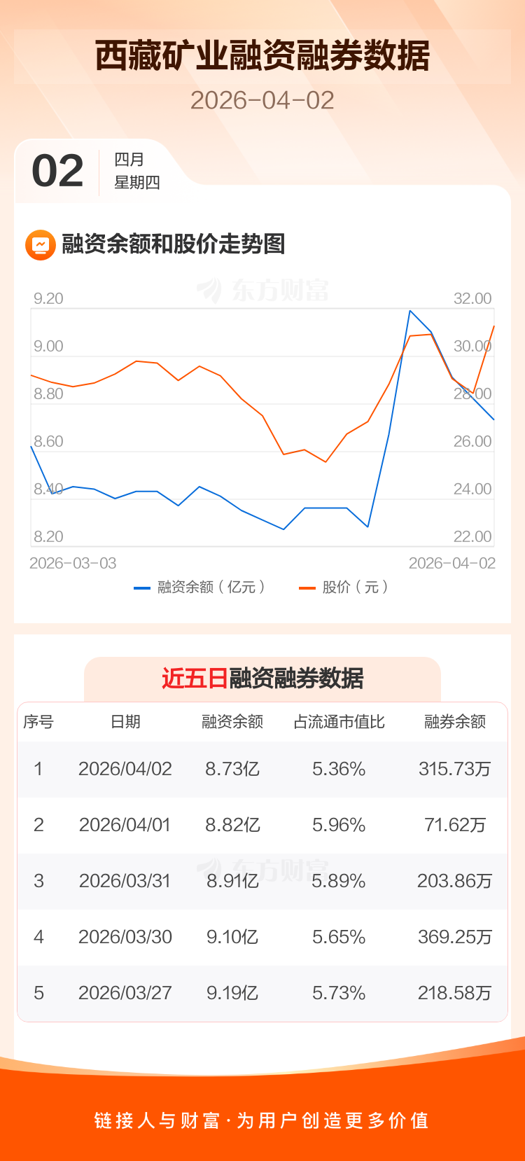 交易所最新数据显示,西藏矿业于2026年4月2日获融资买入1.77亿元,融资偿还1.87亿元,当日融资净偿还938.23万元。目前,该股融资余额8.73亿,占流通市值比例为5.36%。