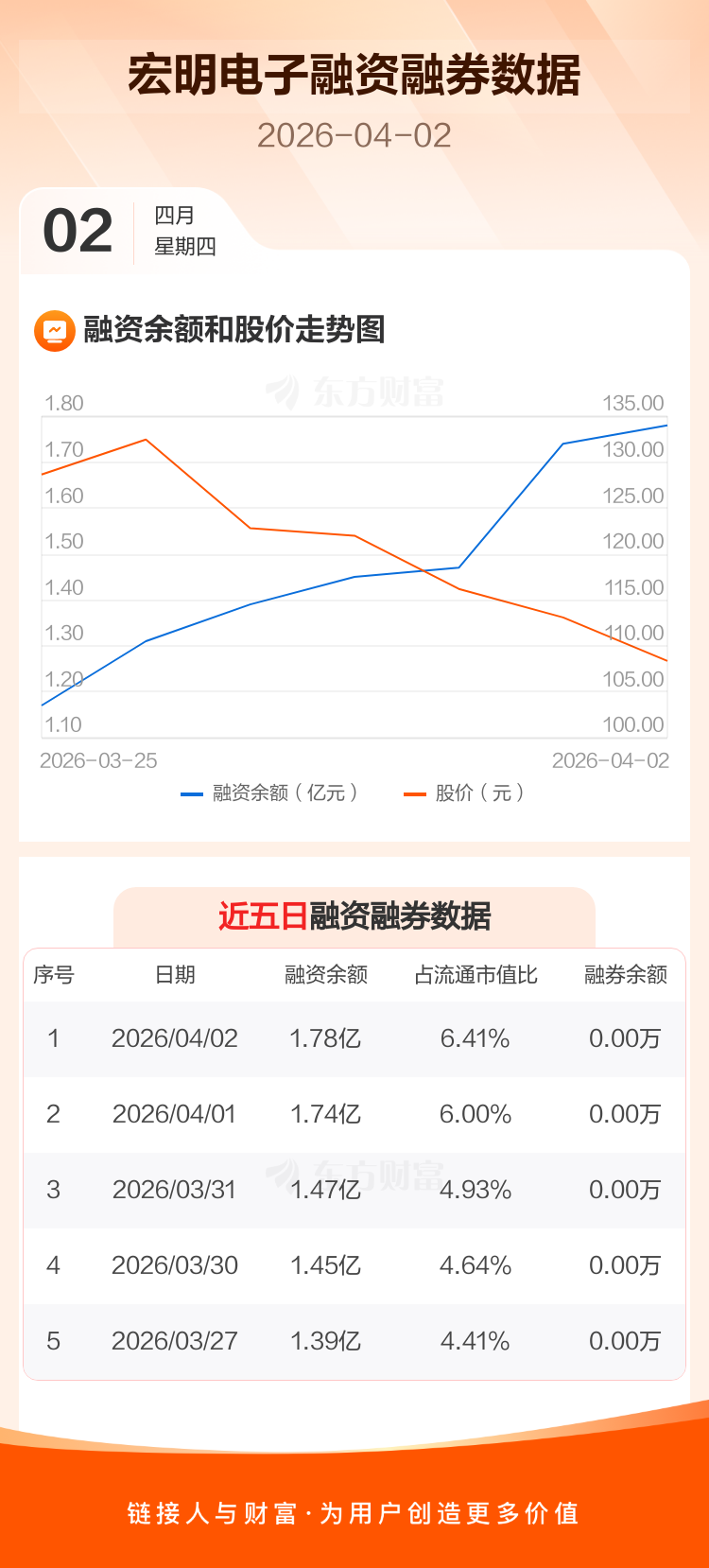 交易所最新数据显示,宏明电子于2026年4月2日获融资买入4189.24万元,融资偿还3784.81万元,当日融资净买入404.42万元。目前,该股融资余额1.78亿,占流通市值比例为6.41%。