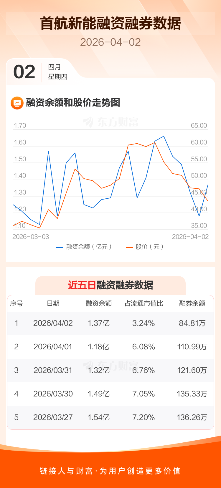 交易所最新数据显示,首航新能于2026年4月2日获融资买入5809.55万元,融资偿还3927.50万元,当日融资净买入1882.05万元。目前,该股融资余额1.37亿,占流通市值比例为3.24%。