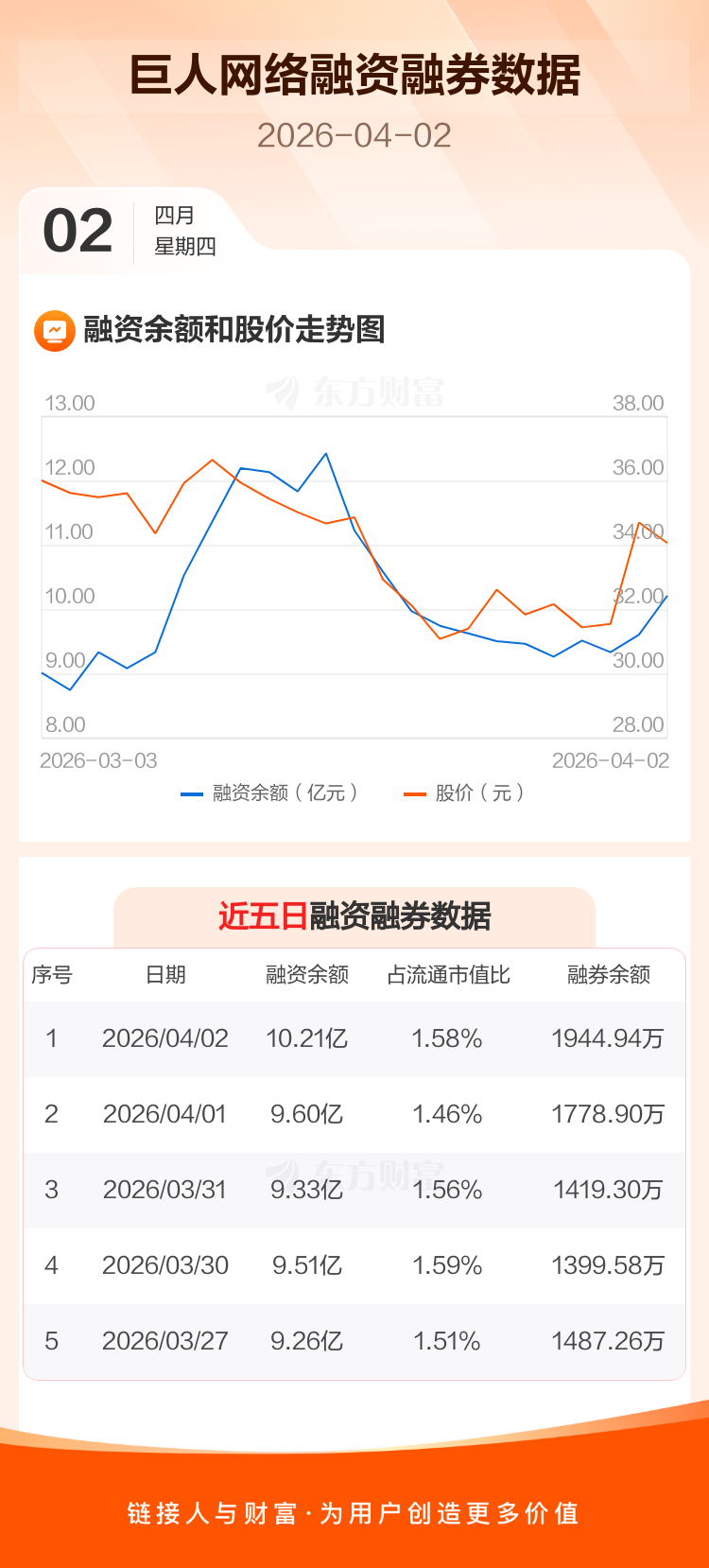 交易所最新数据显示,巨人网络于2026年4月2日获融资买入1.37亿元,融资偿还7633.36万元,当日融资净买入6081.58万元。目前,该股融资余额10.21亿,占流通市值比例为1.58%。