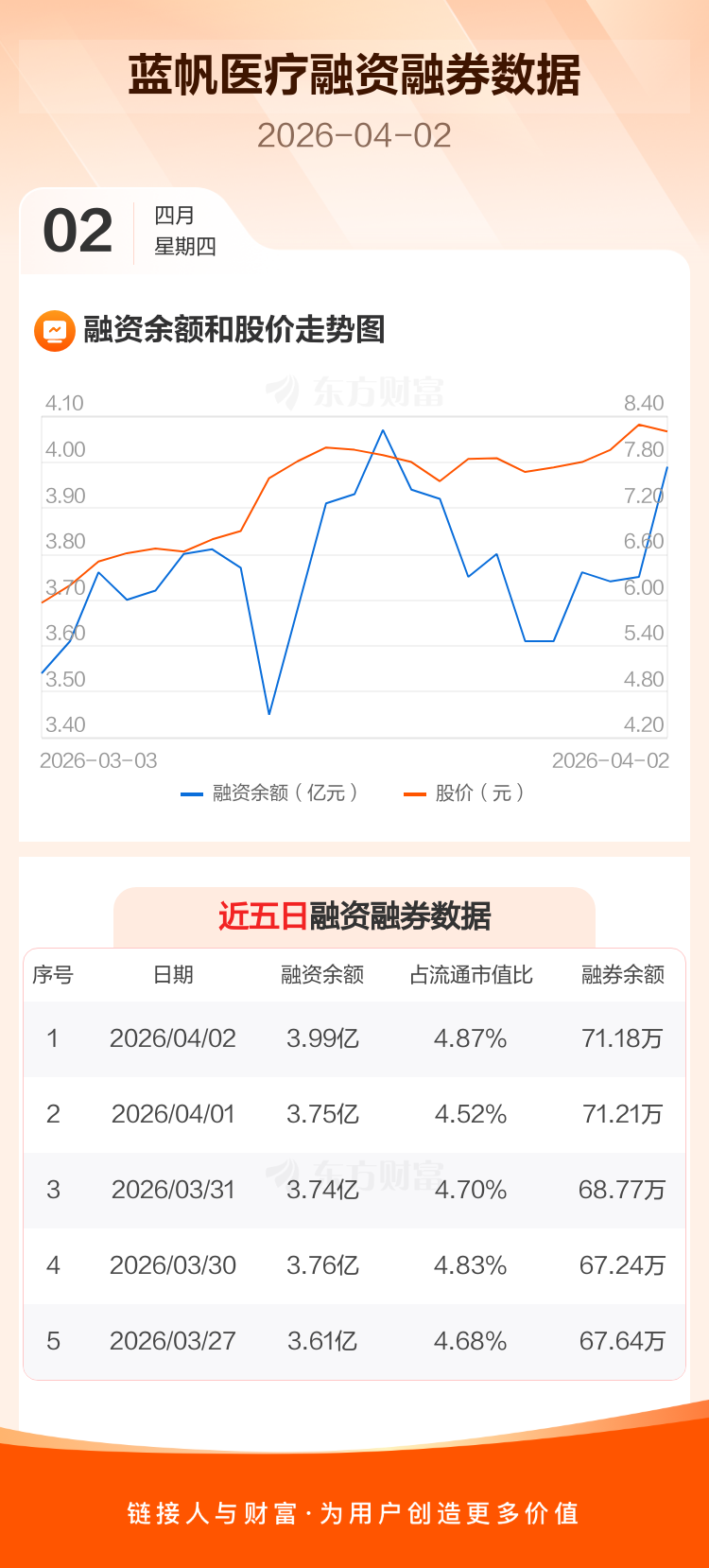 交易所最新数据显示,蓝帆医疗于2026年4月2日获融资买入5160.07万元,融资偿还2774.41万元,当日融资净买入2385.66万元。目前,该股融资余额3.99亿,占流通市值比例为4.87%。