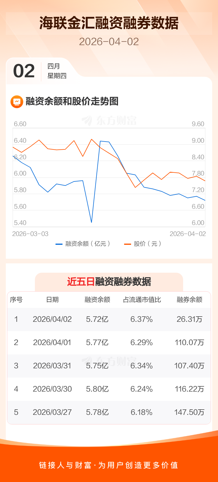 交易所最新数据显示,海联金汇于2026年4月2日获融资买入1147.79万元,融资偿还1675.72万元,当日融资净偿还527.93万元。目前,该股融资余额5.72亿,占流通市值比例为6.37%。