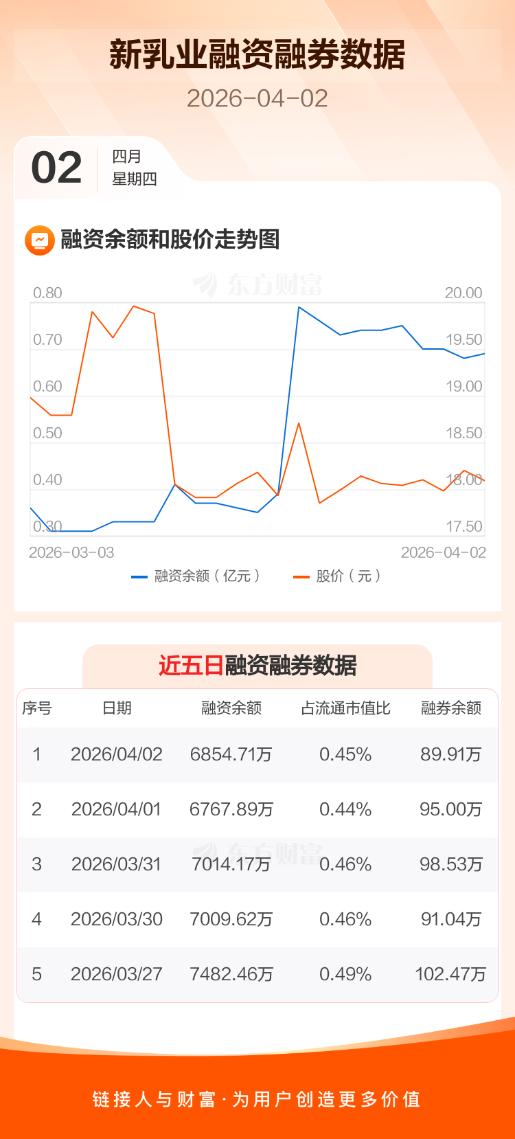 交易所最新数据显示,新乳业于2026年4月2日获融资买入351.90万元,融资偿还265.07万元,当日融资净买入86.83万元。目前,该股融资余额6854.71万,占流通市值比例为0.45%。