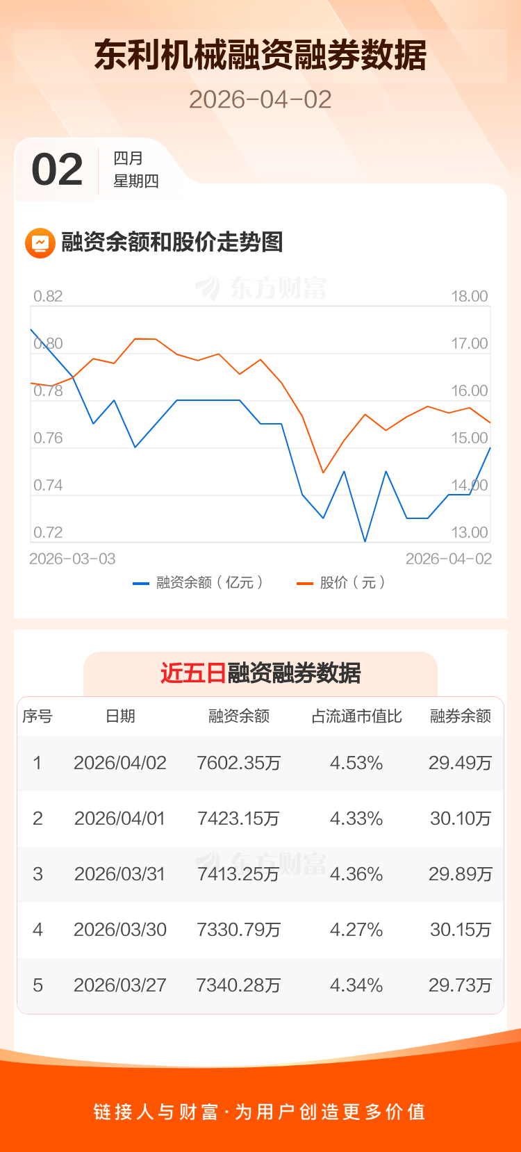交易所最新数据显示,东利机械于2026年4月2日获融资买入507.94万元,融资偿还328.74万元,当日融资净买入179.2万元。目前,该股融资余额7602.35万,占流通市值比例为4.53%。
