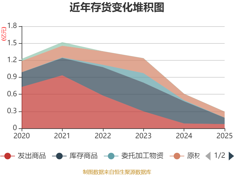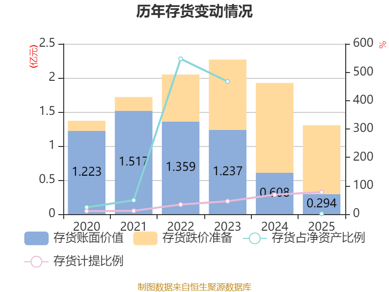 从存货变动来看,截至2025年末,公司存货账面价值为2940.93万元,占净资产的1.47%,较上年末减少3136.58万元。其中,存货跌价准备为1.01亿元,计提比例为77.47%。