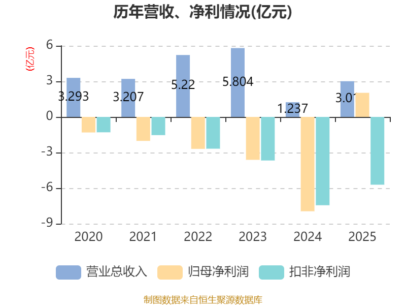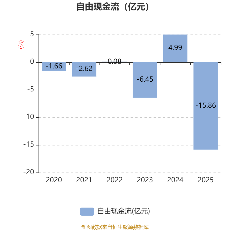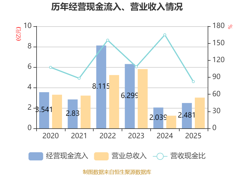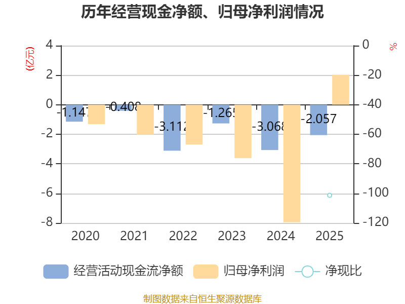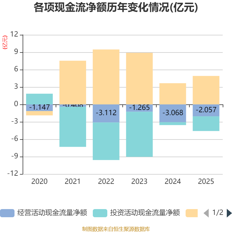 截至2025年,公司经营活动现金流净额为-2.06亿元,同比增加1.01亿元;筹资活动现金流净额4.91亿元,同比增加1.25亿元;投资活动现金流净额-2.53亿元,上年同期为-4969.78万元。
