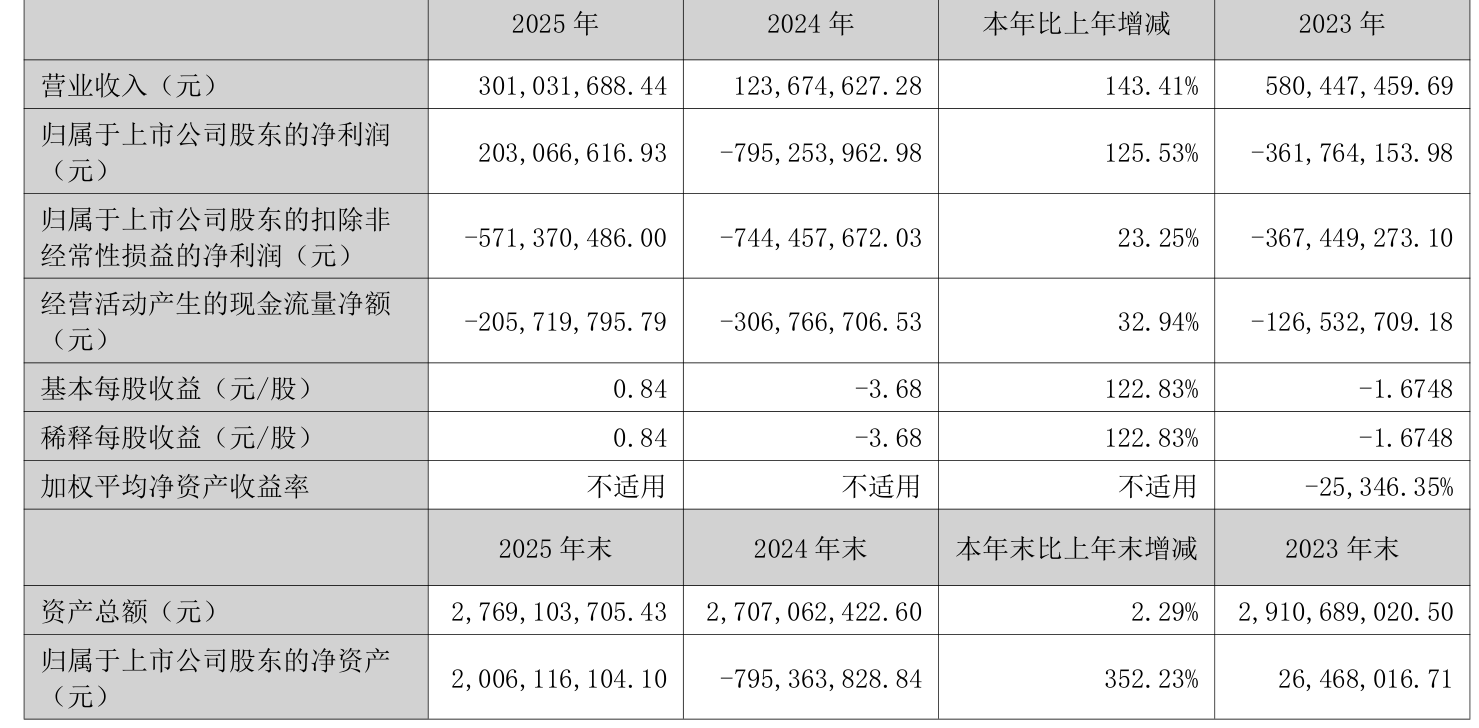 中证智能财讯 *ST金刚(300093)4月3日披露2025年年度报告。2025年,公司实现营业总收入3.01亿元,同比增长143.41%;归母净利润2.03亿元,同比扭亏;扣非净利润亏损5.71亿元,上年同期亏损7.44亿元;经营活动产生的现金流量净额为-2.06亿元,上年同期为-3.07亿元;报告期内,*ST金刚基本每股收益为0.84元。