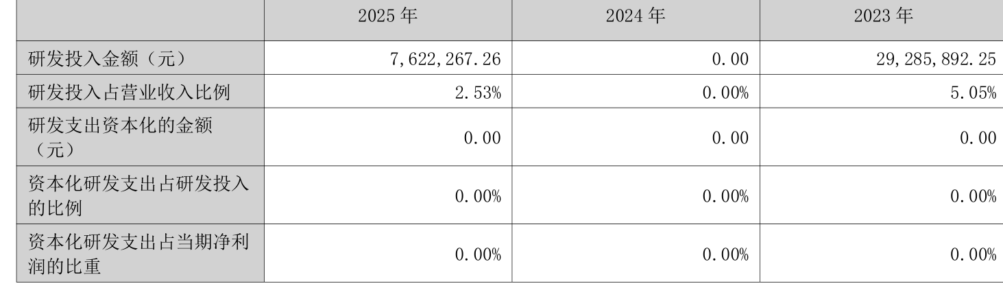 2025年全年,公司研发投入金额为762.23万元;研发投入占营业收入比例为2.53%。此外,公司全年研发投入资本化率为0%。