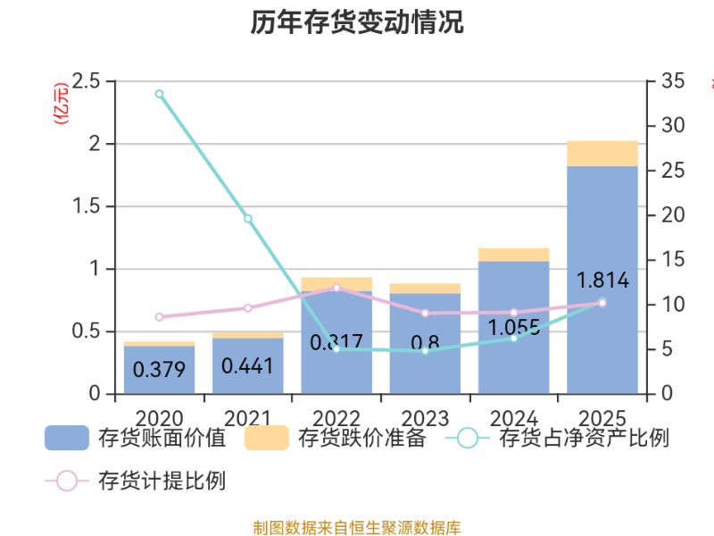 从存货变动来看,截至2025年末,公司存货账面价值为1.81亿元,占净资产的10.31%,较上年末增加7590.95万元。其中,存货跌价准备为2037.56万元,计提比例为10.1%。
