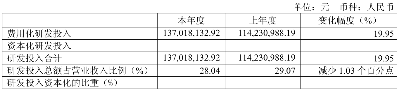 2025年全年,公司研发投入金额为1.37亿元,同比增长19.95%;研发投入占营业收入比例为28.04%,相比上年同期下降1.03个百分点。