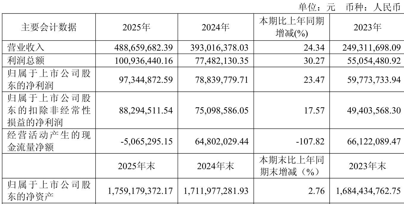 中证智能财讯赛微微电(688325)4月3日披露2025年年度报告。2025年,公司实现营业总收入4.89亿元,同比增长24.34%;归母净利润9734.49万元,同比增长23.47%;扣非净利润8829.45万元,同比增长17.57%;经营活动产生的现金流量净额为-506.53万元,上年同期为6480.2万元;报告期内,赛微微电基本每股收益为1.1663元,加权平均净资产收益率为5.65%。公司2025年度分配预案为:拟向全体股东每10股派现13元(含税)。
