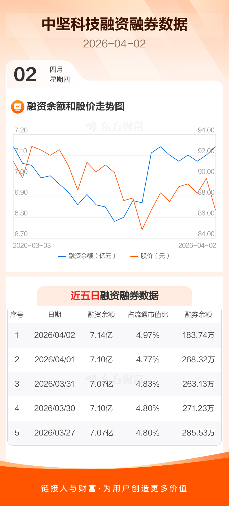 交易所最新数据显示,中坚科技于2026年4月2日获融资买入1288.69万元,融资偿还949.87万元,当日融资净买入338.82万元。目前,该股融资余额7.14亿,占流通市值比例为4.97%。