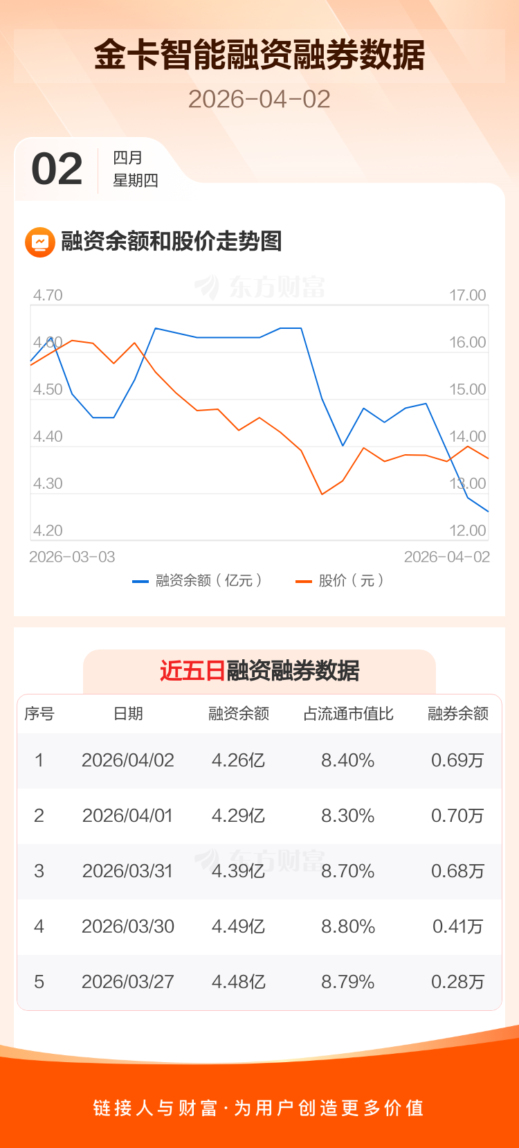 交易所最新数据显示,金卡智能于2026年4月2日获融资买入605.57万元,融资偿还867.79万元,当日融资净偿还262.21万元。目前,该股融资余额4.26亿,占流通市值比例为8.40%。