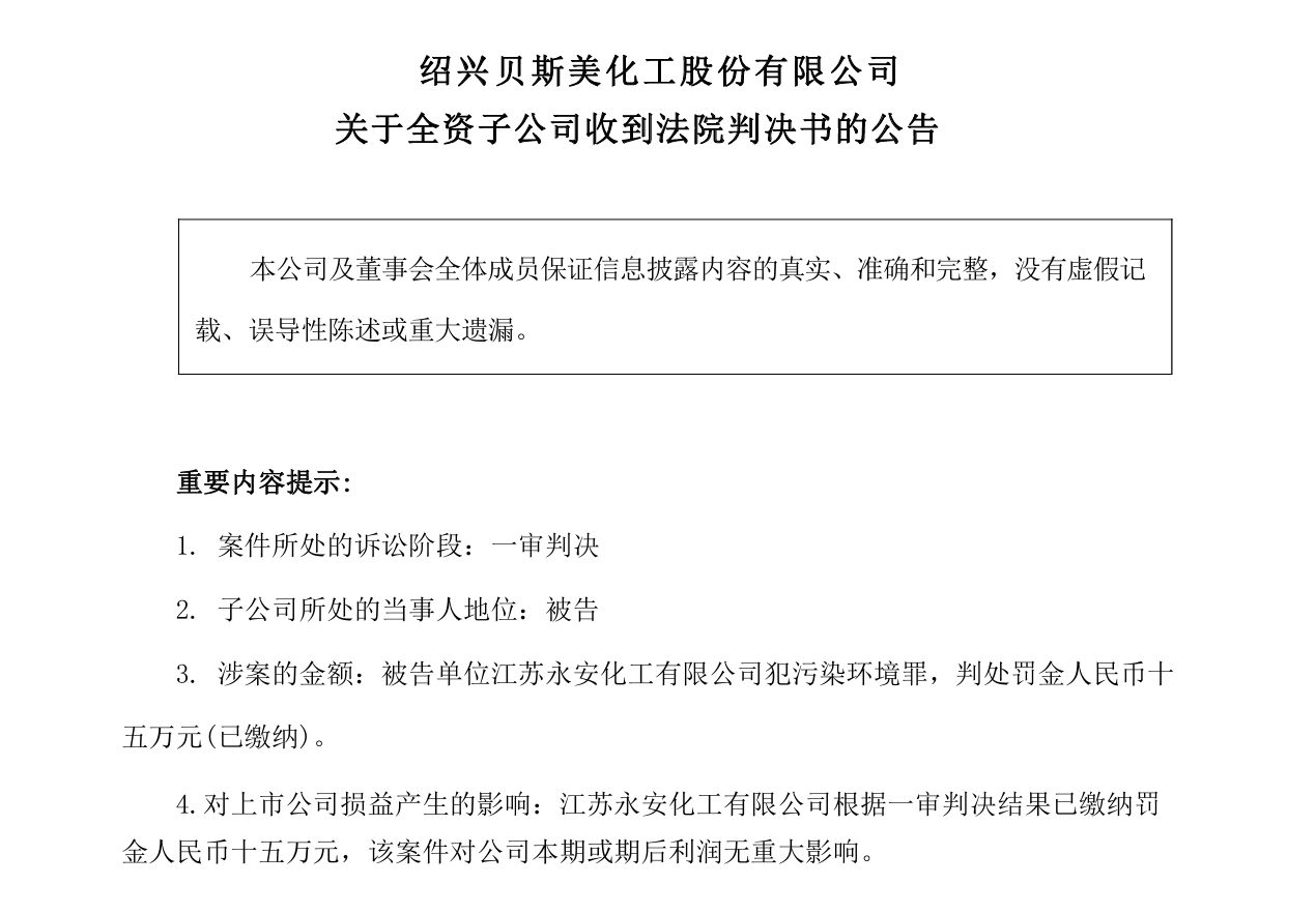 贝斯美表示,针对此次诉讼的问题事项,永安化工已在2024年完成整改,涟水生态环境局对永安化工整改情况进行了督察,永安化工废气治理设施和废气在线设备的改造符合相关整改要求。截至本公告披露日,永安化工的生产经营活动正常开展,永安化工根据一审判决结果已缴纳罚金,该案件对公司本期或期后利润无重大影响。