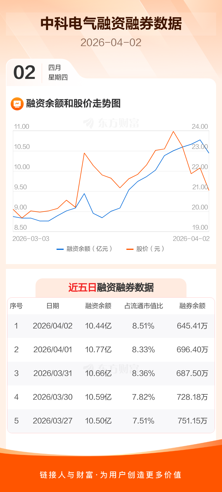 交易所最新数据显示,中科电气于2026年4月2日获融资买入1.05亿元,融资偿还1.37亿元,当日融资净偿还3243.5万元。目前,该股融资余额10.44亿,占流通市值比例为8.51%。