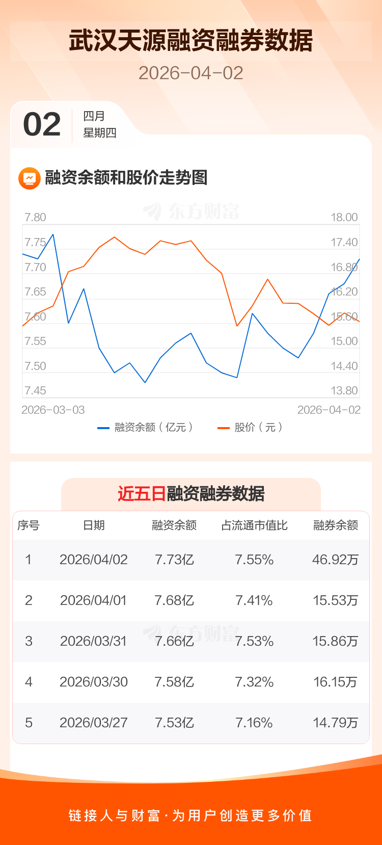 交易所最新数据显示,武汉天源于2026年4月2日获融资买入1216.22万元,融资偿还758.90万元,当日融资净买入457.33万元。目前,该股融资余额7.73亿,占流通市值比例为7.55%。