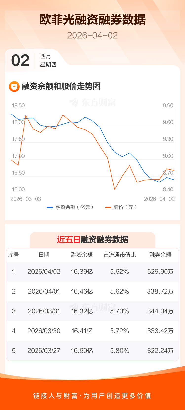 交易所最新数据显示,欧菲光于2026年4月2日获融资买入4832.65万元,融资偿还5514.31万元,当日融资净偿还681.66万元。目前,该股融资余额16.39亿,占流通市值比例为5.62%。