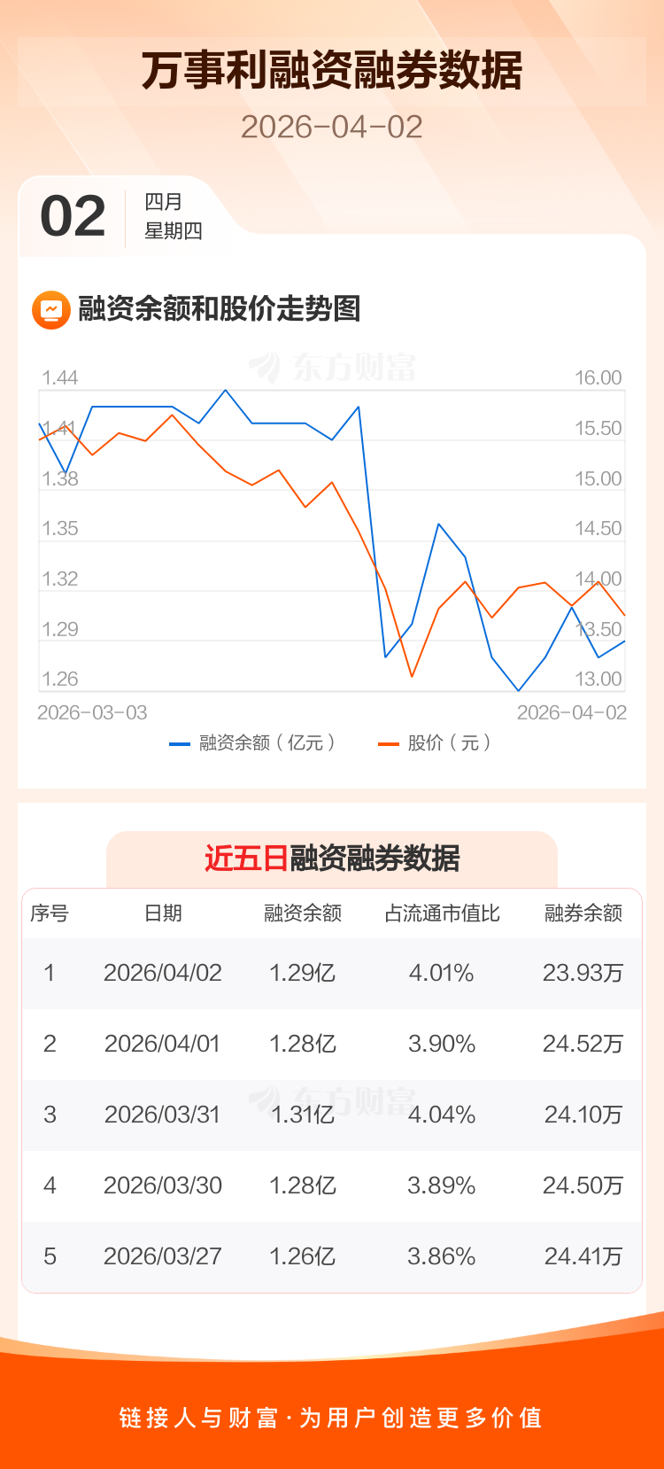 交易所最新数据显示,万事利于2026年4月2日获融资买入478.48万元,融资偿还431.87万元,当日融资净买入46.61万元。目前,该股融资余额1.29亿,占流通市值比例为4.01%。