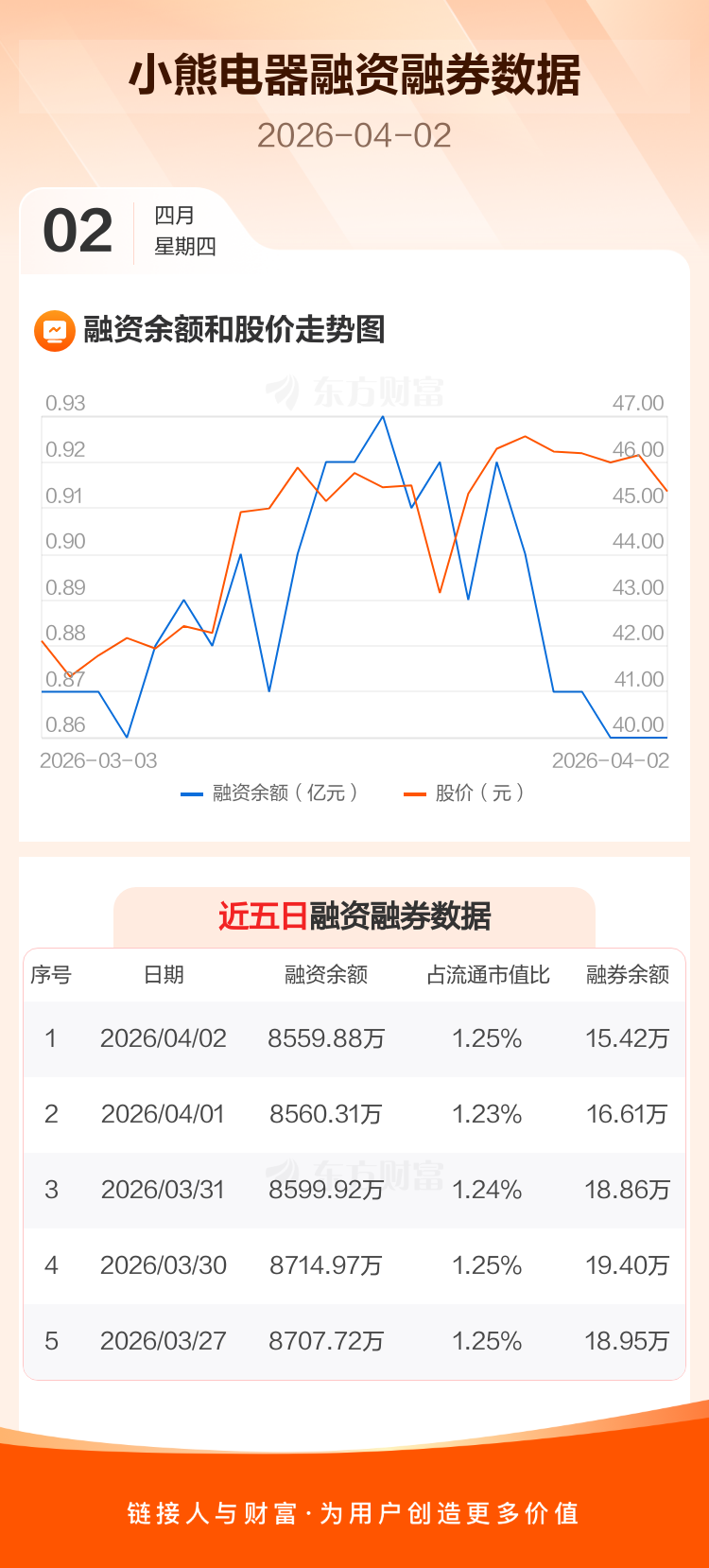 交易所最新数据显示,小熊电器于2026年4月2日获融资买入617.62万元,融资偿还618.05万元,当日融资净偿还4310元。目前,该股融资余额8559.88万,占流通市值比例为1.25%。
