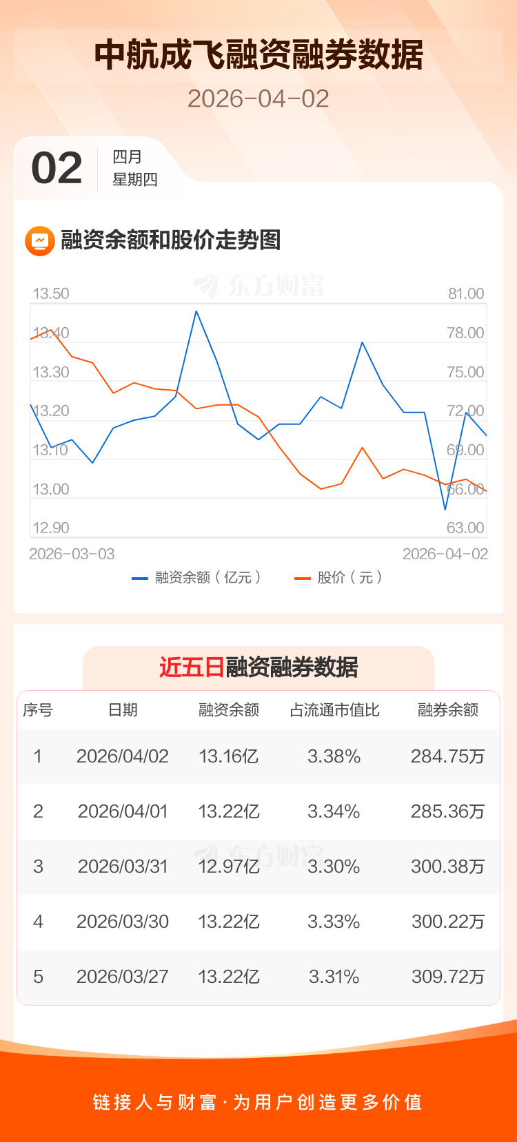 交易所最新数据显示,中航成飞于2026年4月2日获融资买入1175.40万元,融资偿还1771.15万元,当日融资净偿还595.75万元。目前,该股融资余额13.16亿,占流通市值比例为3.38%。