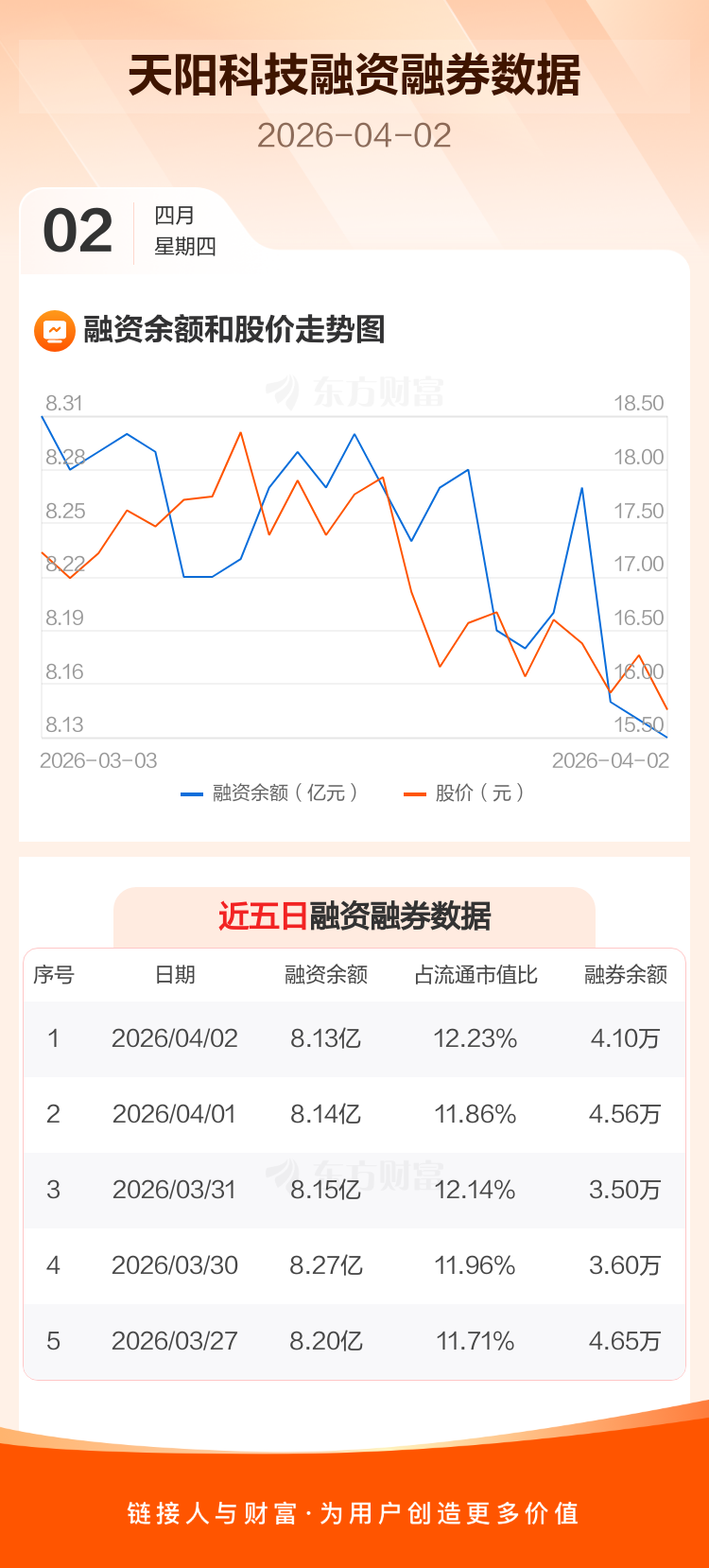 交易所最新数据显示,天阳科技于2026年4月2日获融资买入877.05万元,融资偿还986.65万元,当日融资净偿还109.6万元。目前,该股融资余额8.13亿,占流通市值比例为12.23%。