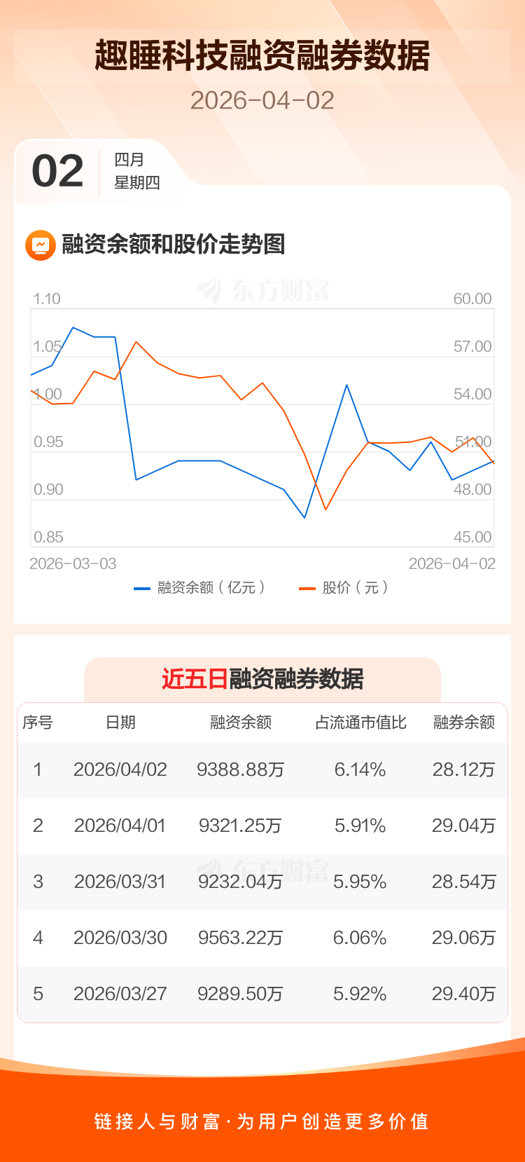 交易所最新数据显示,趣睡科技于2026年4月2日获融资买入336.55万元,融资偿还268.92万元,当日融资净买入67.63万元。目前,该股融资余额9388.88万,占流通市值比例为6.14%。