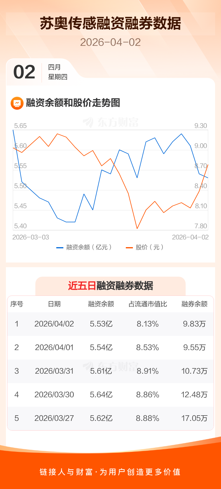 交易所最新数据显示,苏奥传感于2026年4月2日获融资买入3909.82万元,融资偿还3995.56万元,当日融资净偿还85.74万元。目前,该股融资余额5.53亿,占流通市值比例为8.13%。