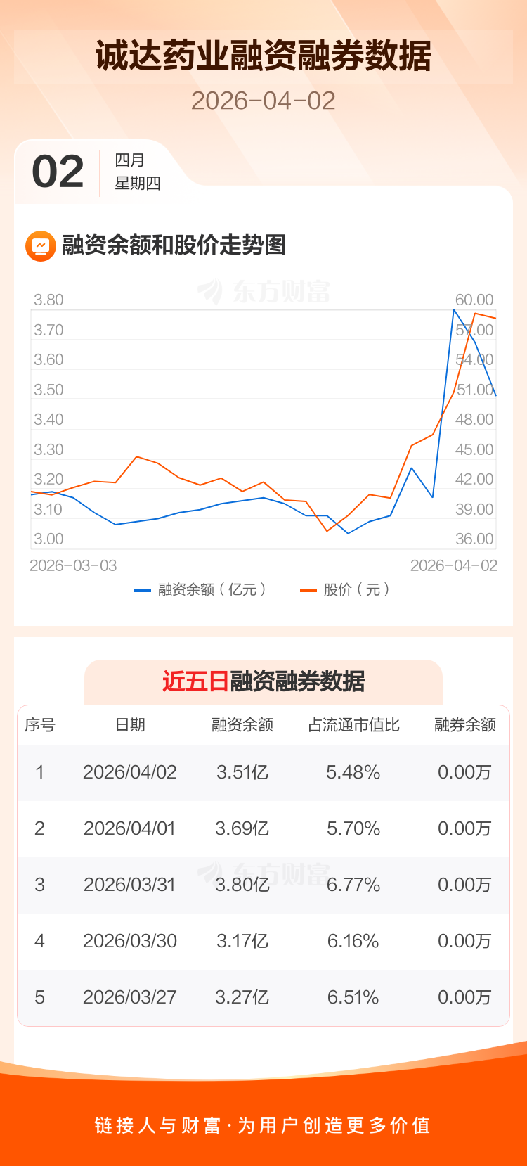 交易所最新数据显示,诚达药业于2026年4月2日获融资买入1.95亿元,融资偿还2.12亿元,当日融资净偿还1750.29万元。目前,该股融资余额3.51亿,占流通市值比例为5.48%。