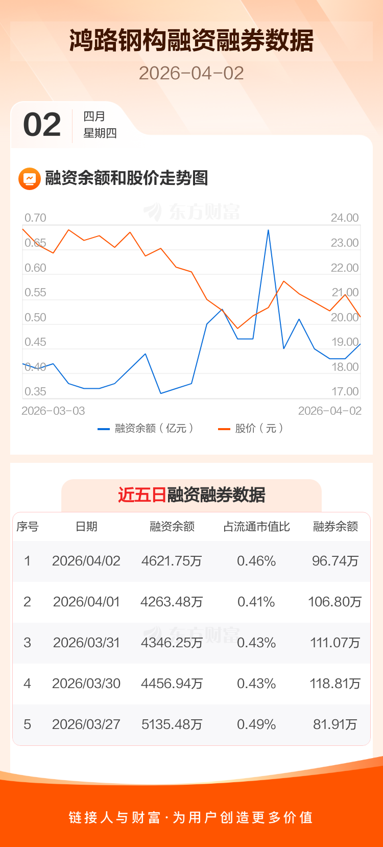 交易所最新数据显示,鸿路钢构于2026年4月2日获融资买入901.09万元,融资偿还542.82万元,当日融资净买入358.27万元。目前,该股融资余额4621.75万,占流通市值比例为0.46%。
