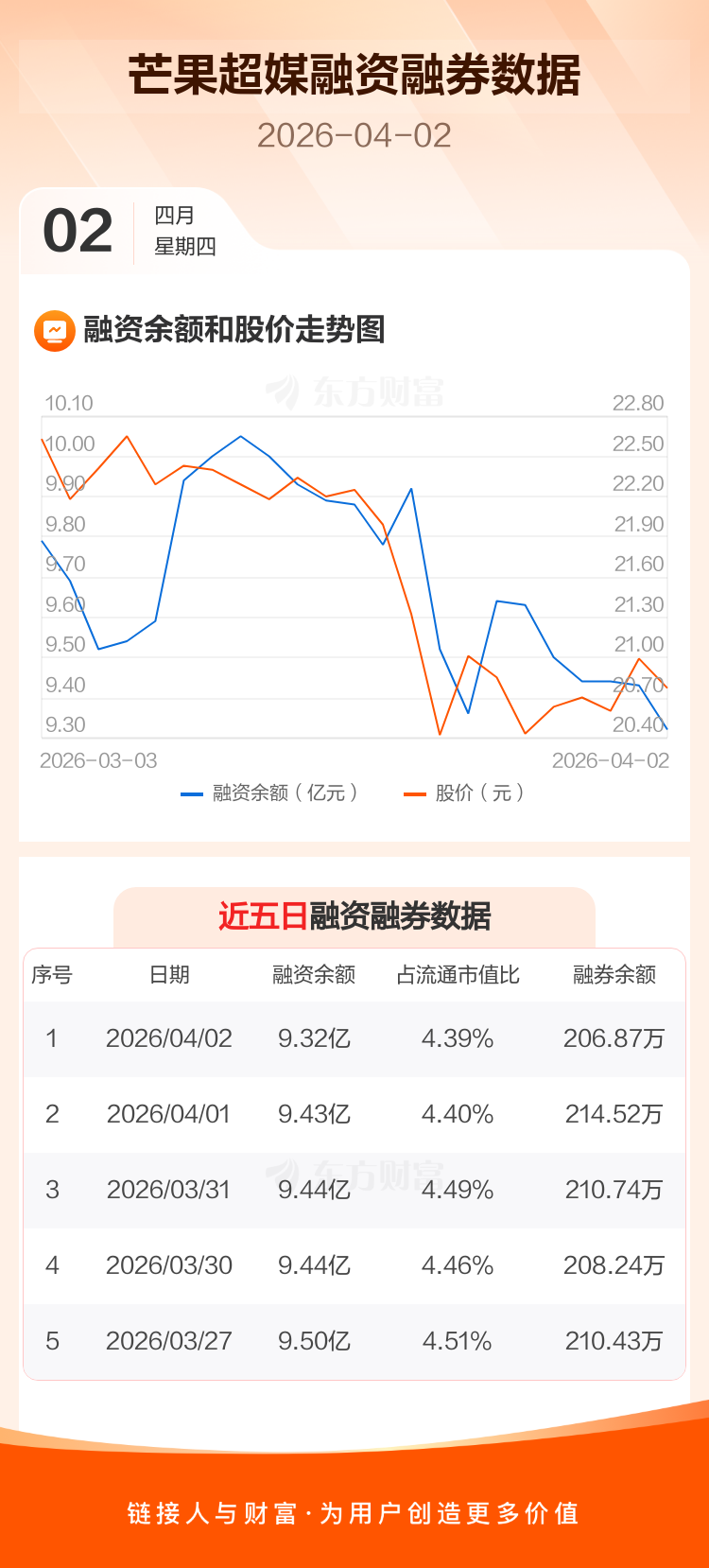 交易所最新数据显示,芒果超媒于2026年4月2日获融资买入1416.46万元,融资偿还2565.91万元,当日融资净偿还1149.45万元。目前,该股融资余额9.32亿,占流通市值比例为4.39%。