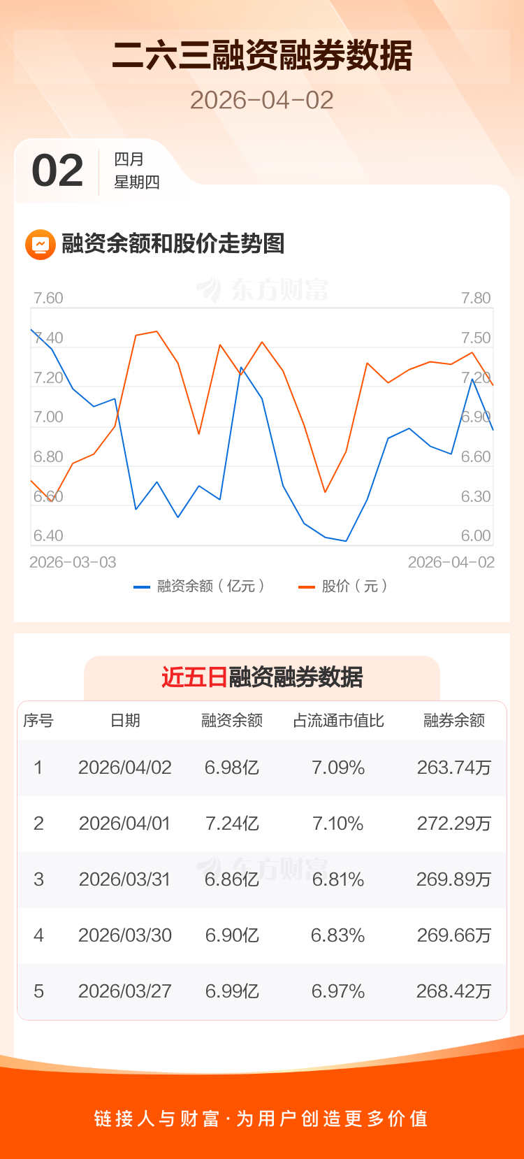 交易所最新数据显示,二六三于2026年4月2日获融资买入7529.07万元,融资偿还1.01亿元,当日融资净偿还2530.52万元。目前,该股融资余额6.98亿,占流通市值比例为7.09%。