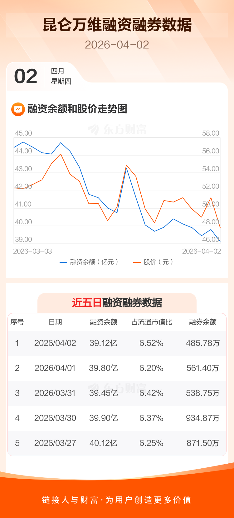 交易所最新数据显示,昆仑万维于2026年4月2日获融资买入2.89亿元,融资偿还3.58亿元,当日融资净偿还6866.88万元。目前,该股融资余额39.12亿,占流通市值比例为6.52%。