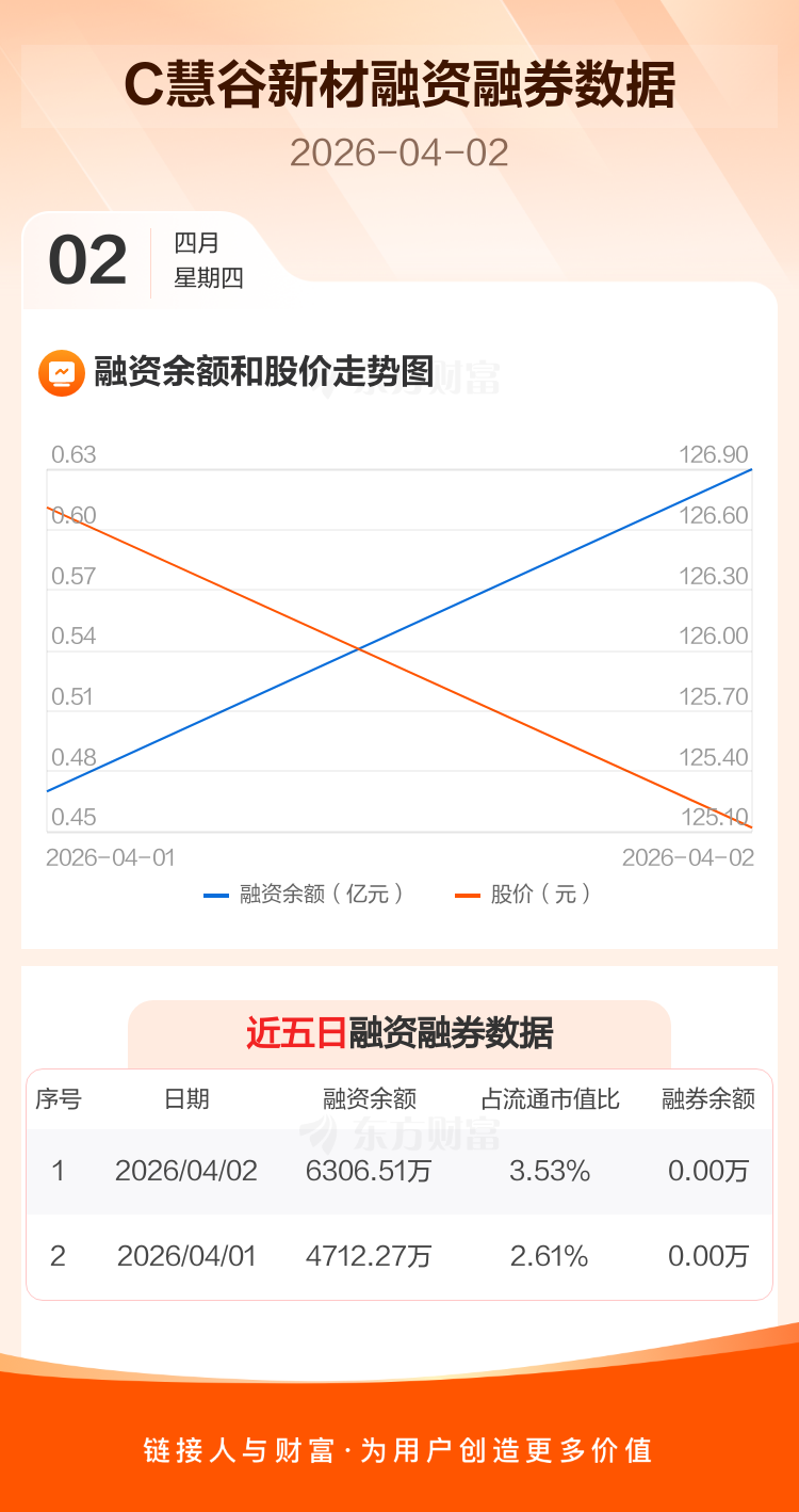 交易所最新数据显示,C慧谷新材于2026年4月2日获融资买入4479.60万元,融资偿还2885.37万元,当日融资净买入1594.23万元。目前,该股融资余额6306.51万,占流通市值比例为3.53%。