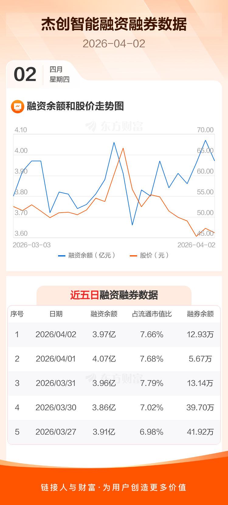 交易所最新数据显示,杰创智能于2026年4月2日获融资买入1919.13万元,融资偿还2925.81万元,当日融资净偿还1006.69万元。目前,该股融资余额3.97亿,占流通市值比例为7.66%。