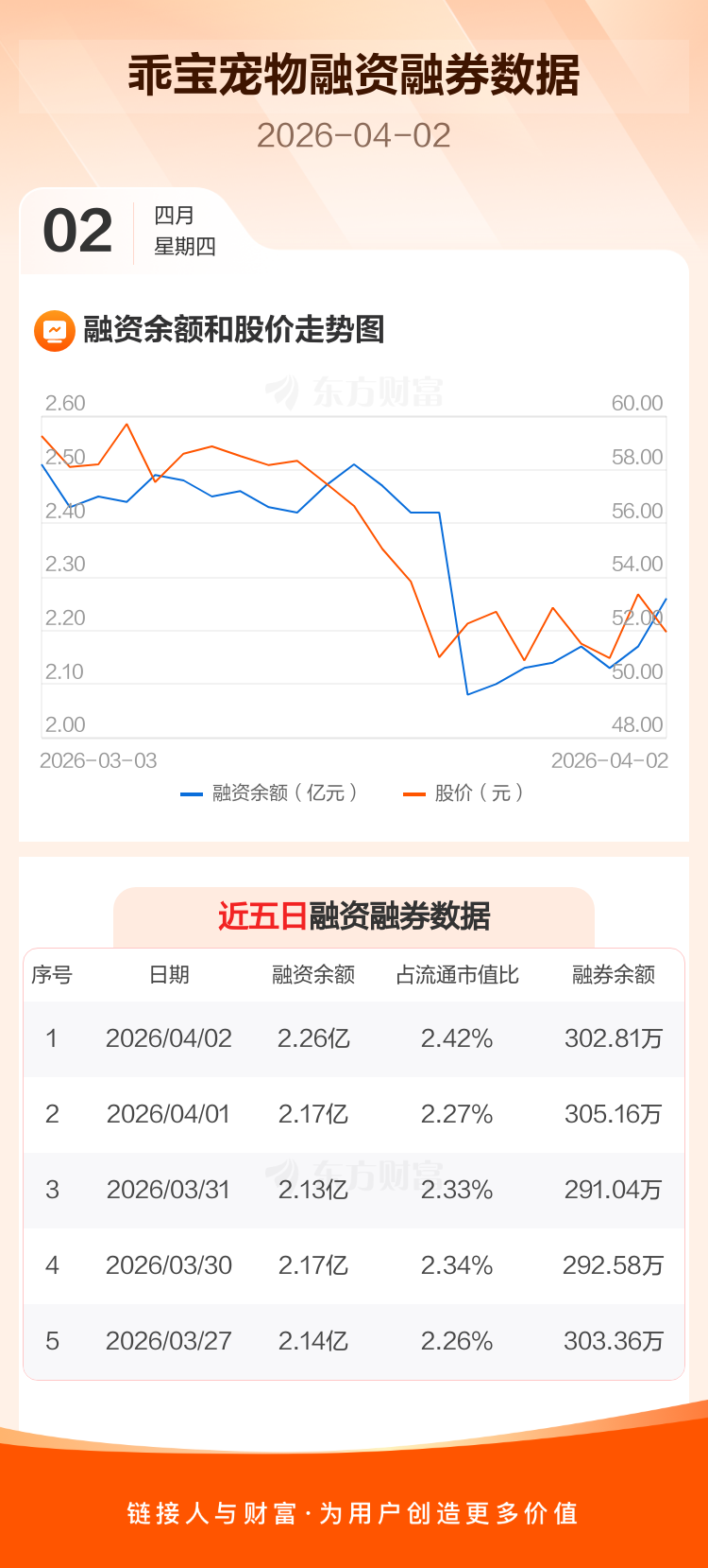 交易所最新数据显示,乖宝宠物于2026年4月2日获融资买入2803.17万元,融资偿还1908.15万元,当日融资净买入895.02万元。目前,该股融资余额2.26亿,占流通市值比例为2.42%。