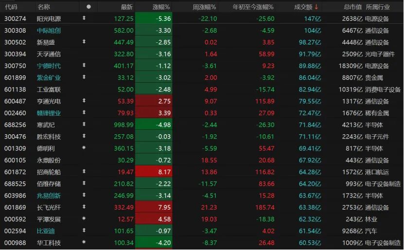 个股跌多涨少,共计4378只个股收跌,跌停股16只;1052只个股收涨,涨停股32只。今日仅有两只个股日成交额超过100亿元,阳光电源收跌5.36%报127.25元/股,中际旭创收跌3.3%报582元/股。