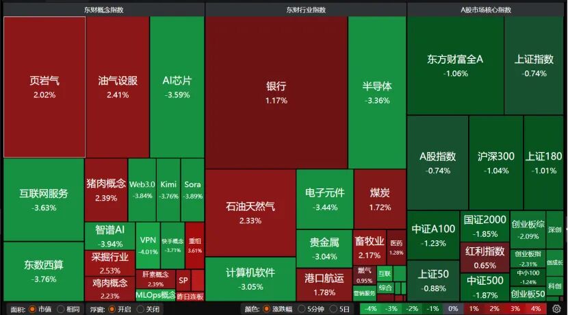 盘面上,页岩气、油气设服、银行、港口航运、煤炭、猪肉概念、鸡肉概念大涨,但AI芯片、半导体、计算机软件、贵金属、电子元件、智谱AI大跌。