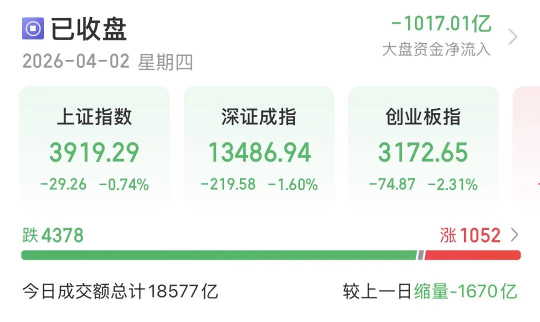 指数表现不佳,午后加速下行,双创指数大跌。沪指收跌0.74%报3919.29点,创业板指收跌2.31%报3172.65点,深证成指收跌1.6%。科创50收跌2.77%,沪深300、上证50跌约1%,北证50微红。