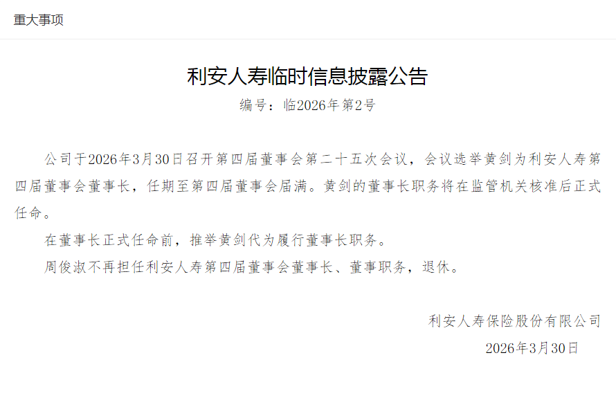 稍早之前,2月24日,黄剑已以公司党委书记身份出席利安人寿召开的“新春第一会”。他在新春寄语中指出,2026年,利安人寿要以资负管理提质年为工作主脉络,加快提升效益和价值,巩固风险防线,推动持续稳健经营。