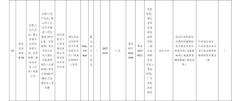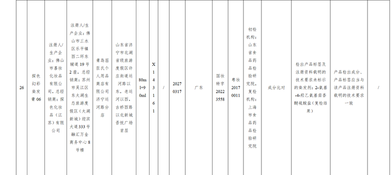 具体来看,这两批次探色幻彩染发膏06,均被检出产品标签及注册资料载明的技术要求未标示的染发剂:2-氨基-4-羟乙氨基茴香醚硫酸盐(复检结果),规定要求产品检出成分、产品标签应当与该产品注册资料载明的技术要求一致。