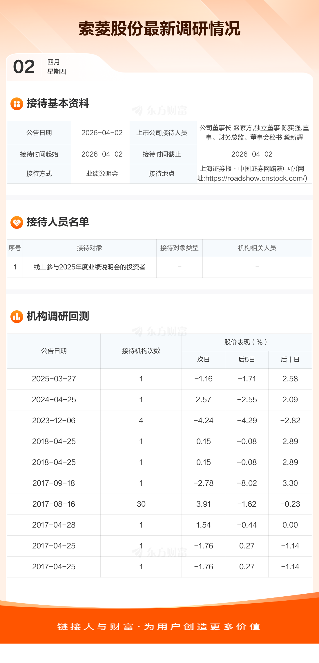 索菱股份4月2日公告称,4月2日接待线上参与2025年度业绩说明会的投资者等1家机构调研。接待人员包括公司董事长 盛家方,独立董事 陈实强,董事、财务总监、董事会秘书 蔡新辉。