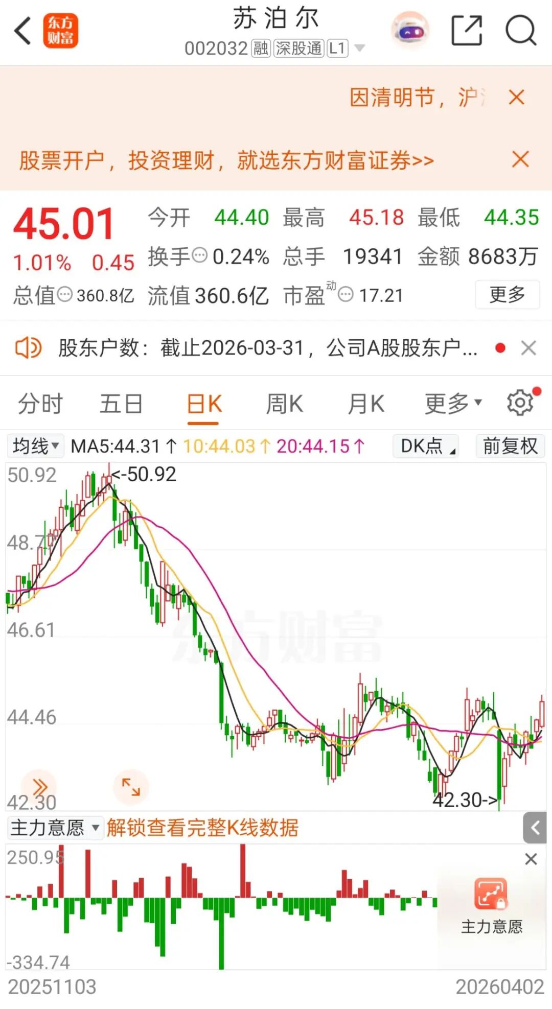 截至4月2日收盘,苏泊尔报45.01元/股,上涨1.01%,总市值为360.8亿元。
