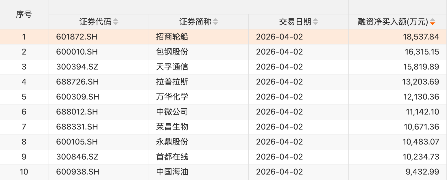个股方面,9只个股获融资净买入额超1亿元。招商轮船获融资净买入额居首,净买入1.85亿元;融资净买入额居前的还有包钢股份、天孚通信、拉普拉斯、万华化学、中微公司、荣昌生物、永鼎股份、首都在线、中国海油。