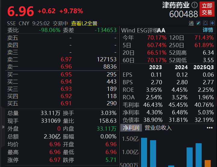津药药业大幅高开超9%,公告称,公司研发以仿制药为主,无在研创新药项目。
