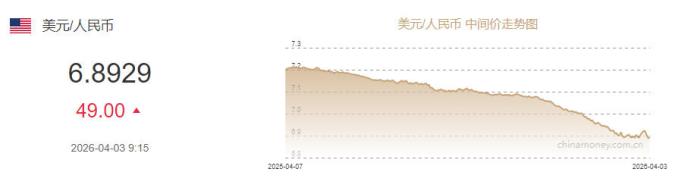 4月3日人民币对美元中间价报6.8929 下调49个基点